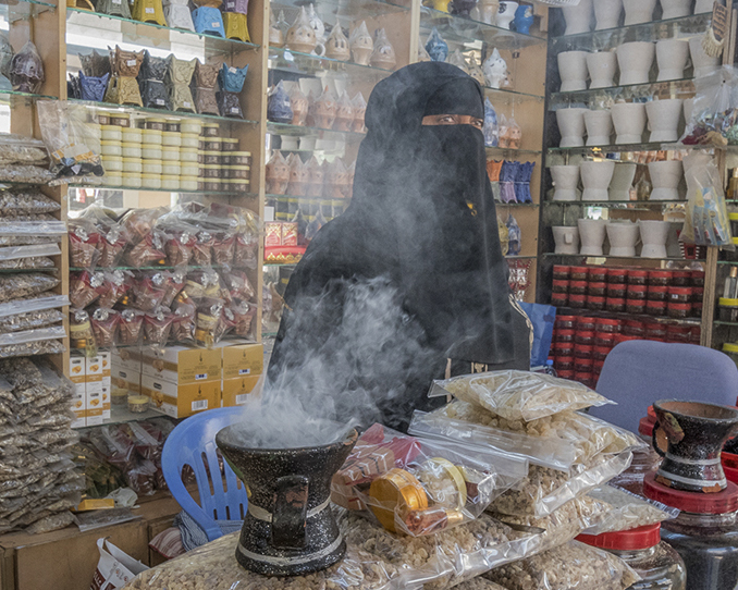 Isaac .. this store is chock full of stuff and the smoke and veil add to make the image very interesting. I am drawn to the intensity of the woman's eyes and the smoke adds to the mystery. This image has a clear and defined subject. May I suggest cropping the image to the left and bottom to make the woman more prominent in the frame and exclude some of the paraphernalia in the store.