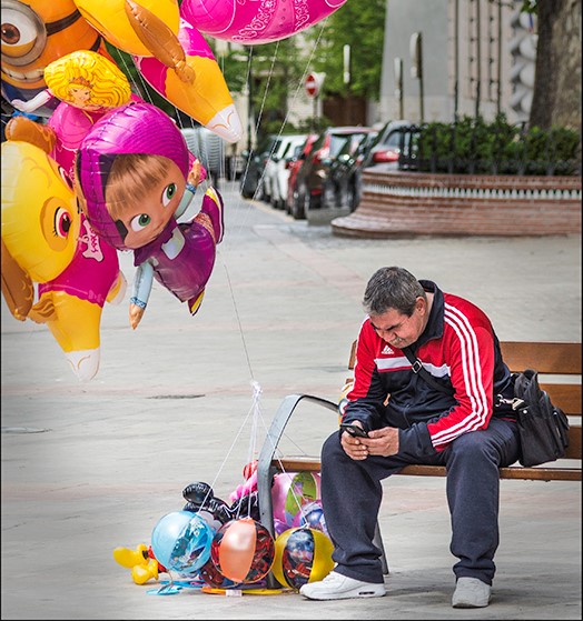 Nice story telling image...the deflated balloons at his feet add to the story. I offer an alternate "flipped" version and cropped a bit more to focus on the vendor.