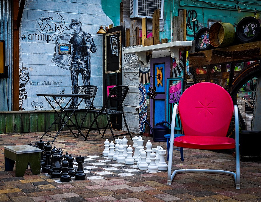 Dan.. red is the color of the day! There is a human element with the painting of the man on the back wall and the whole image gives the viewer a lot interesting things to look at. To me, a slight crop off the left edge cleans up the image and brings the focus back to the chair. |