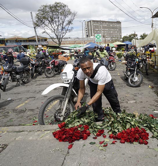 Deborah.. the capture of the man's eyes and stare draws me into the image. The red roses are incongruous among the street motorcycles. I almost feel that we can crop the woman on the right and the building and make the man the complete focus; but up to you of course. |