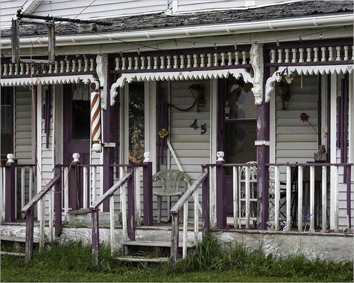 Interesting shop façade - purple ornate "Victorian?". The lawn is freshly mowed so presumably the barber shop is open for customers. Interesting textures throughout . I feel the center of interest is the shop door and all the kitsch around. Perhaps excluding a bit of the left and right sections to focus on this section? |