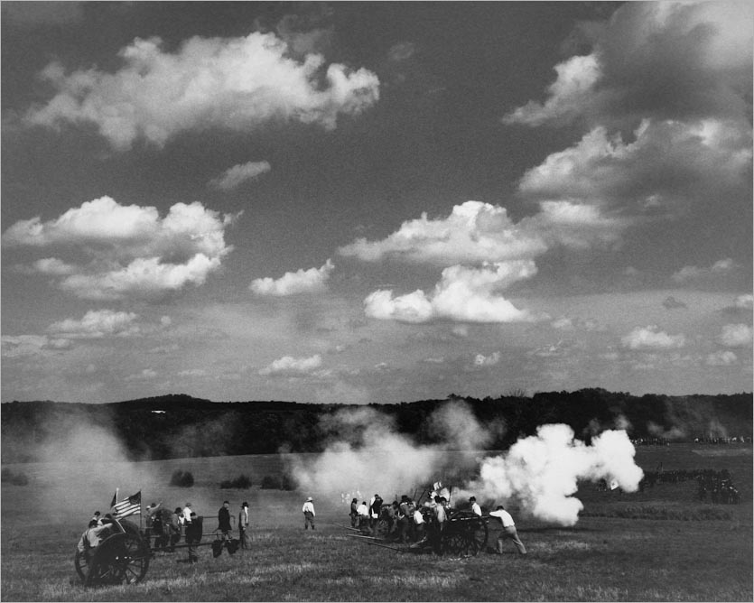 Jim..one can almost hear the boom and roar of the cannons. I like the flag and the man pushing with all his might. Offered is a different alternative- the original whole sky is included; but cropped in to the center and converted to B&W. This helps retain the horizon line on the thirds. |
