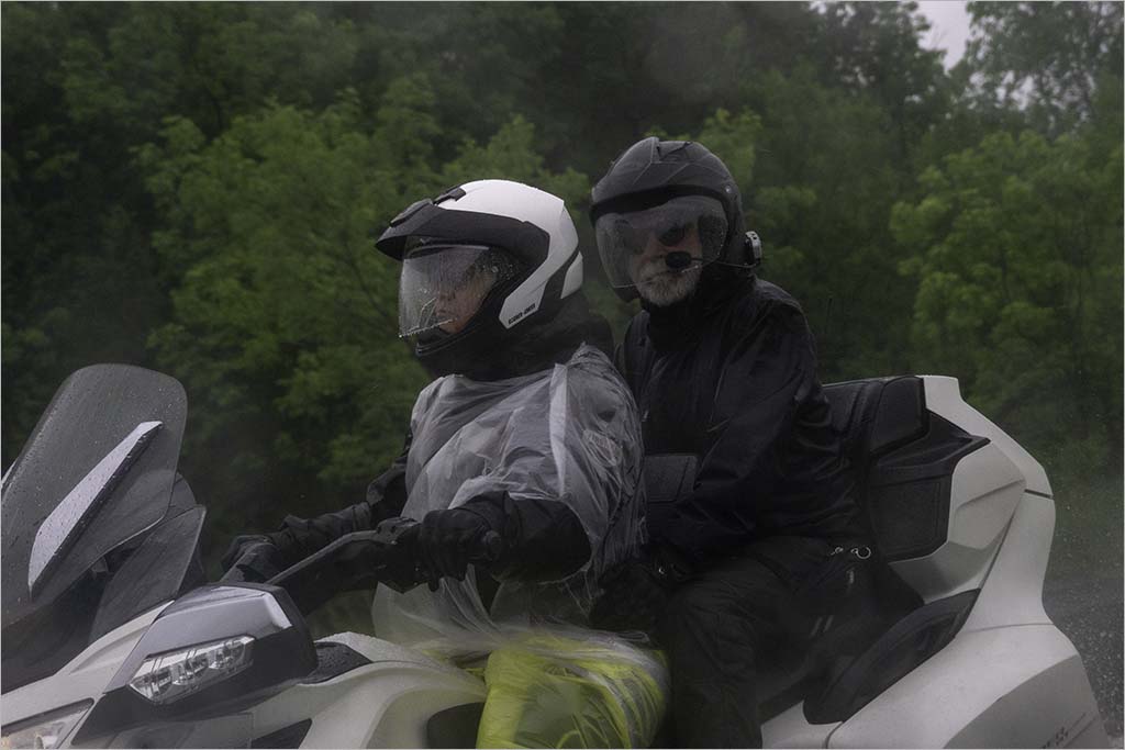 Thanks for your comments Isaac. I always appreciate your feedback. I shot this from the front passenger side, and the difficulty was trying to maintain speed on a very busy highway safely i.e a moving car with moving subjects in dark conditions. I managed to get about 7 images, zooming out and in at the same time. The driver is a woman and quite composed and unfazed by traffic or weather.The spots are from my closed car window - I didn't try to remove the spots as I think they added a bokeh and atmosphere. Although the image is mainly monochromatic - I love the touch of yellow added by the makeshift trash bag. You mentioned the crop - and from my seated position would have be near impossible to get the whole front wheel in with the 24-240 lens I had with me at the time. Here is the 1st image in the shoot in which I had zoomed in to fill the frame. |