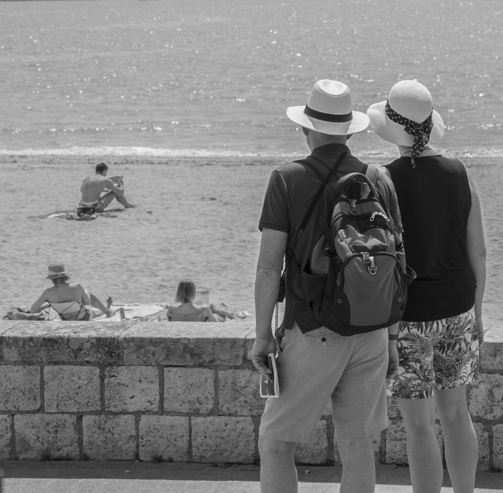 Daniel...yet another variation for consideration. I chose Isaac's crop and converted to B&W because of the high contrast mentioned by both Isaac & Guy. I like the rich blacks of the shirts and the white hats of the two people in the foreground. I prefer Isaac's crop which included the legs and more of the wall, and provided a more balanced composition for me. |