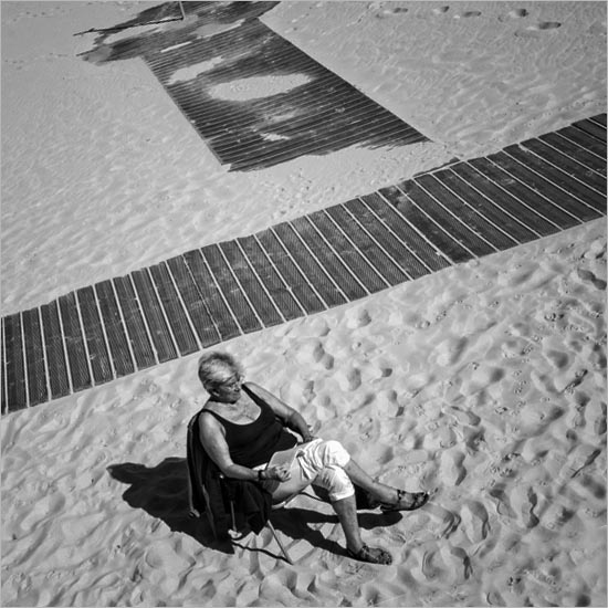 Daniel, I like your conversion to B&W and high up camera position (on a bridge perhaps). Interesting light and cast shadow adds dimension to your image. Nice textures on the footprints in the sand and the wooden slats of the walkway.. I feel the horizontal line of the walkway cuts the image in two and somehow feels imbalanced. The shower pole leads my eye out of the frame. I offer an alternative version- I flipped the image, and rotated the crop so that the walkway forms a diagonal; the woman is balanced diagonally by the short walk. I added a vignette. |