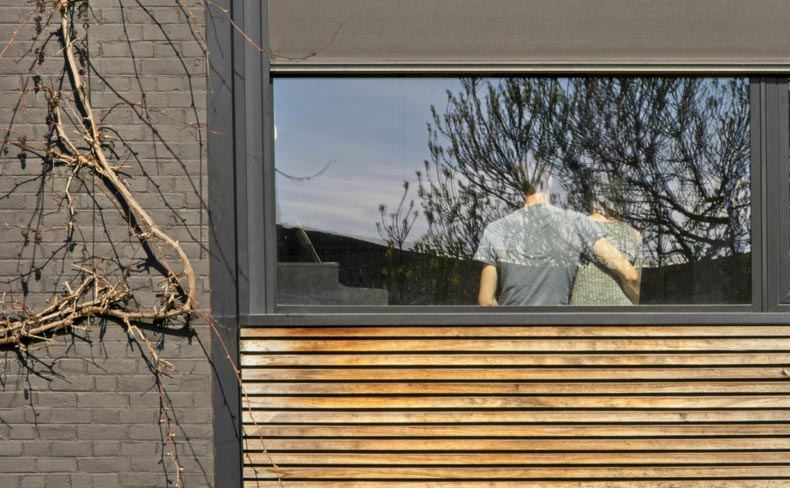 Daniel, this image is an arrangement of rectangles of various sizes; including the bricks on the far left. The textures of each square all provide different interest and the thorny vine is repeated on the reflected image of the tree in the window. The couple have their backs turned and provides the human element reflecting these times. The crop is unusual (1.80:1), and I offer a suggested crop frame which excludes the smaller window on the right and brings the couple to the thirds. Great story. |
