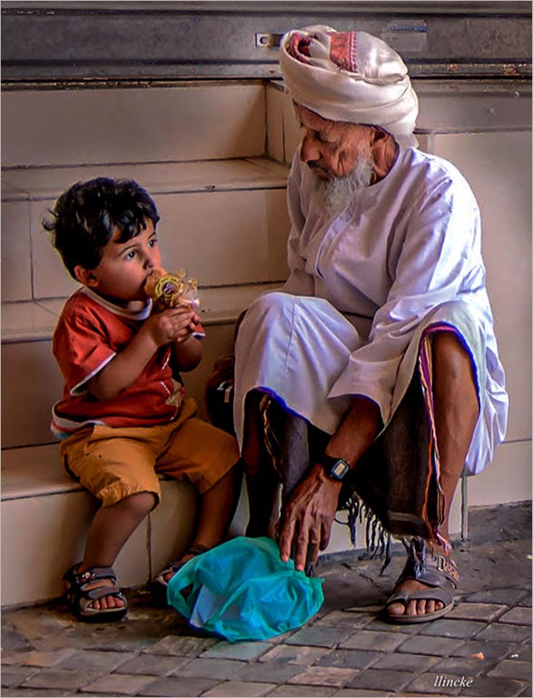 Les ...beautiful lighting that add dimensionality to the image. nice interesting grouping of arms and legs and close relationship between the two subjects. Harmonious colors and clothing typically found in that area of the world. The cyan blue bag adds a color contrast to the cinnamon and orange of the clothing. Good story as the older man enjoys watching his grandson eat. I used perspective crop tool to straighten and level the image somewhat. Great story telling. |