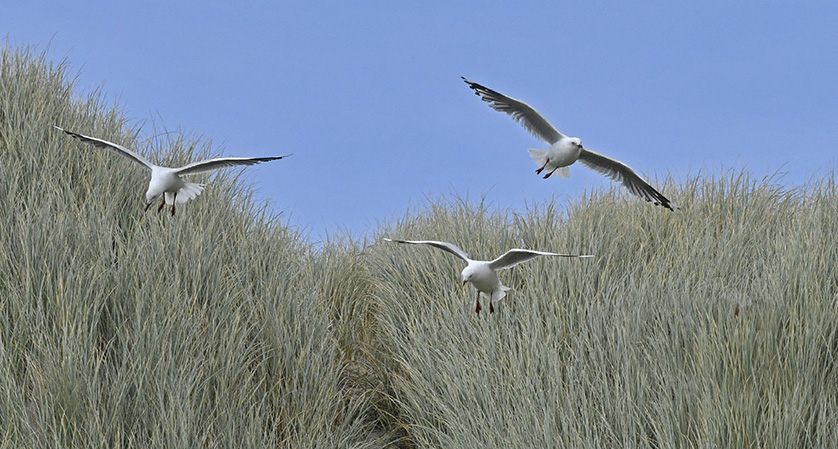 By removing the lower right gull and cropping from the right, you maintain the "V" shape of the grass against the sky, which I think makes the picture much more interesting. |