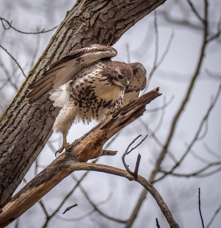 Great action shot with the wings out. I agree to lighten the eyes slightly - you can even add an artificial highlight into the right eye. I would have cropped a little more off the right and bottom, but it is OK as it is to show its environment. |