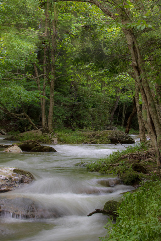 I too have been there, and the image captures the serenity of the forest and stream. It does seem that there are many ways to frame this. Your image draws more attention to the serene canopy of trees first and moves down to the stream. Linda's crop brings you directly to the flow of the stream.I like them both. On a second or third glance, I am struck more by some of the distracting branches on the Canopy view. If you like that version better maybe you could clean that up. I did a quick healing brush tool and clone tool to show what I mean. It is in no way a completed edit, only an idea if you want to. |
