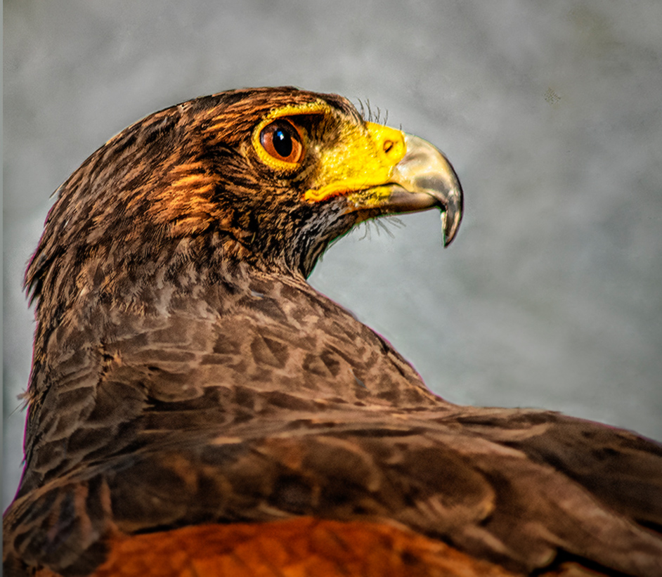 I love the eyes, sharp face and regal look. Two quick fixes that may or may not even improve, are use a duplicate background layer with a gaussian blur and mask on it with the gradient tool to remove head from the blur. Crop if you like it and vignette. The blur is to remove noise from the bottom feathers and vignette to detract from the bottom also and draw the eye to the head. |
