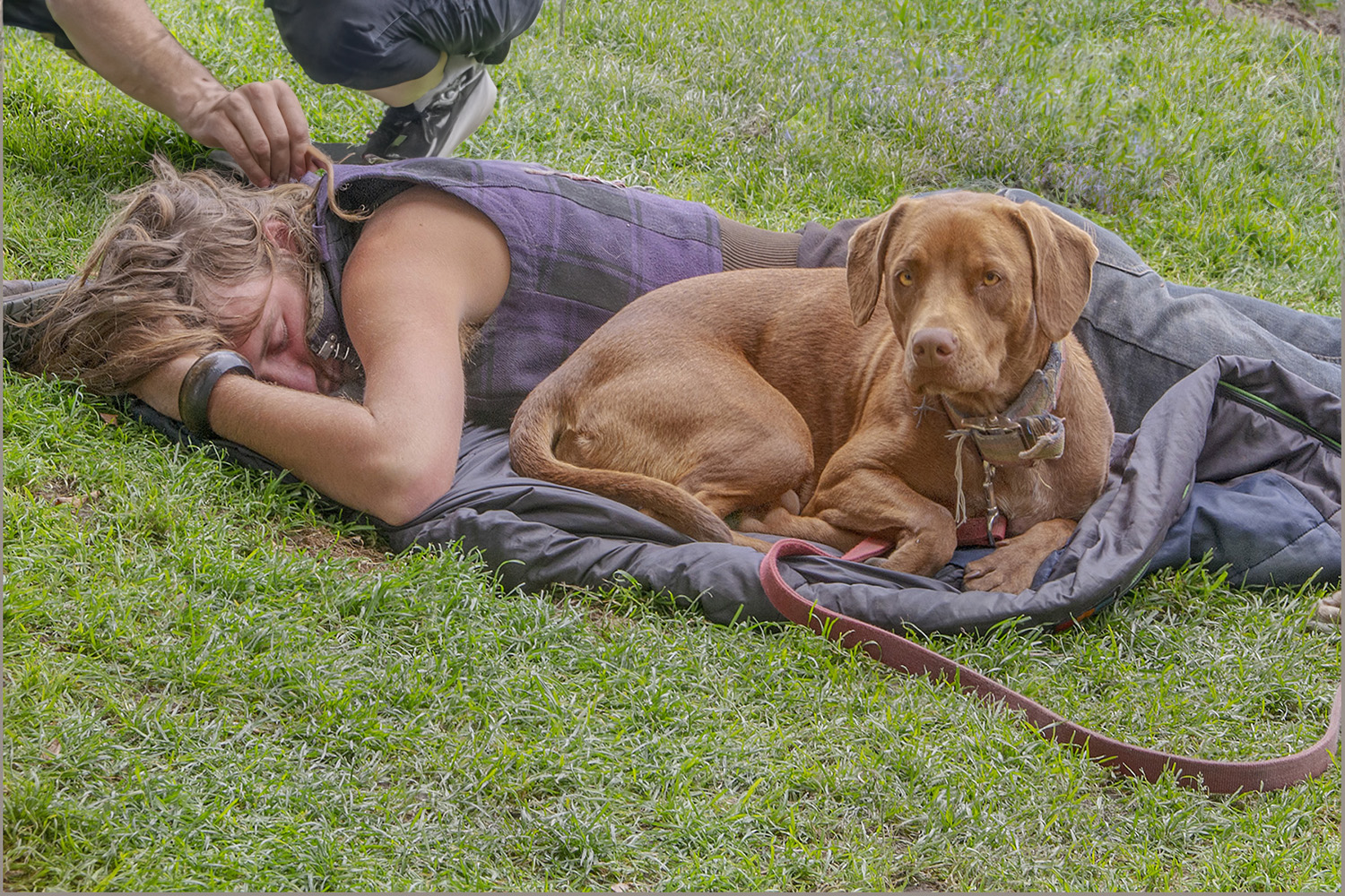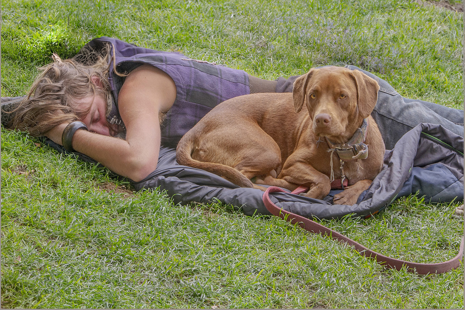 Mark, don't get me wrong. I like the story with the garbage bags also. It helps picture more of who the man is. It also stirs up memories of Seattle and New Orleans. Great capture of the man and dog. I can see he is not just some fun loving hippy and his dog. Maybe it is just my thinking but even the dog looks sad. I only took out the bags because you mentioned that you tried. One other thought, maybe just one bag would be less distracting.