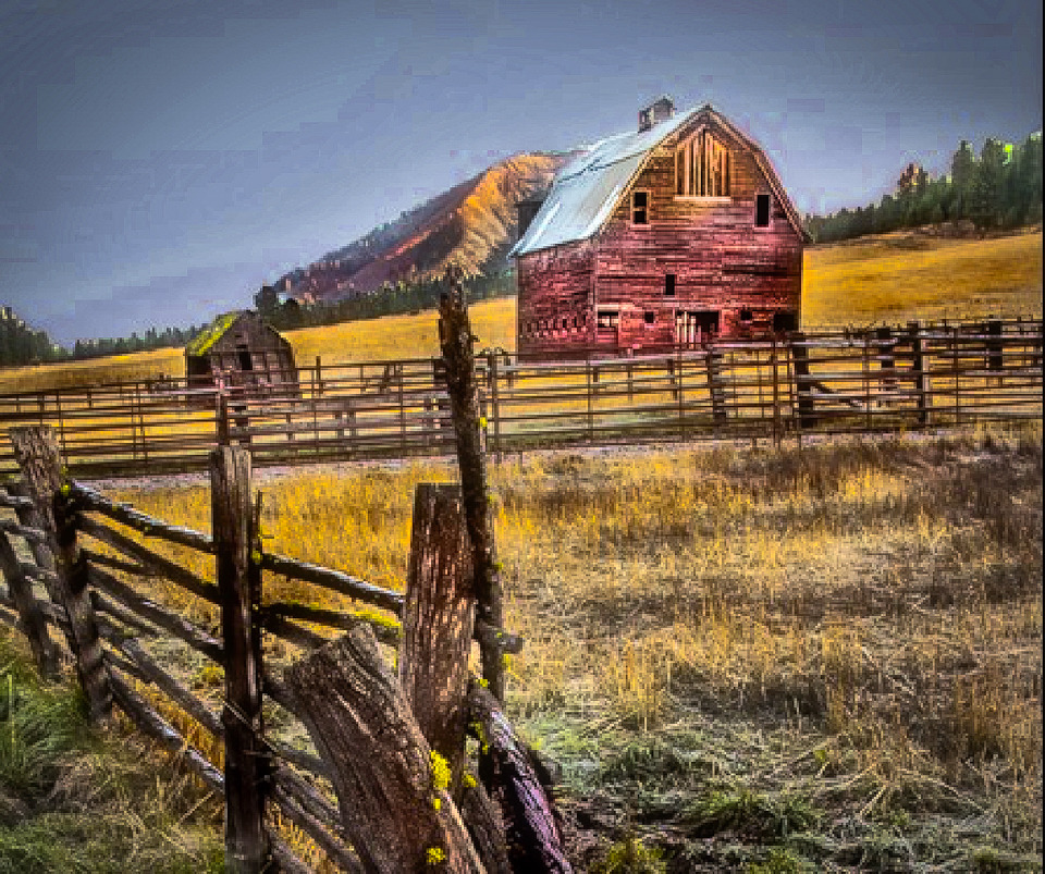 For me, it's a little bit too much of everything. Either the fence is a subject or the barn, but not both. I would go for a barn and crop the bottom - see attached. I would love to see a bit more on the right, but not sure that it's been captured. With my cropping in mind, I would also try to move a few steps to the left or to the right not to have the fence starting in the middle. In terms of post processing - I see traces of it around the barn and below the fence. Now, having said all of that, it's still a very interesting image and it's good as is. The comments are just my subjective opinion.