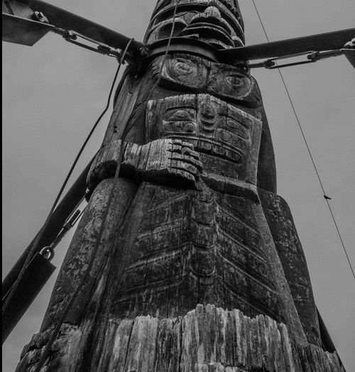 Interesting subject. I am not sure about the angle. Of course, I didn't see the pole and don't know whether shooting from a greater distance was possible, but for me, the composition is off. The image is so busy outside of the pole, that I am looking at the cables around the pole that are intersected with some diagonal bars and create angles around the pole ... oh, my! Than there is another layer with carving on the pole and it competes with the all the diagonals around. Too busy and I am not sure what is the subject here - the pole itself or the structure around. Of course, my opinion is subjective. |