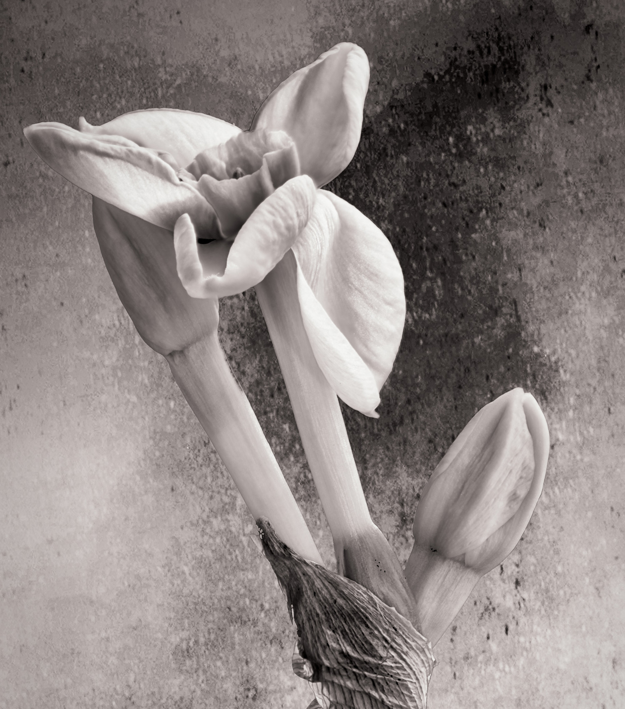 I love shooting flowers in the springtime too. You've done a nice job with this one. I like the fact that your final isn't a stark black/white, and to me it seems like a fine art shot. The lower part of the stem that bends to the left is a bit distracting to my eye. Since it doesn't have the beautiful texture and contrast of the part where the three buds converge, I'd crop that part and then rotate the whole image slightly so the stems are more diagonal. Your added texture in the background is nice. |