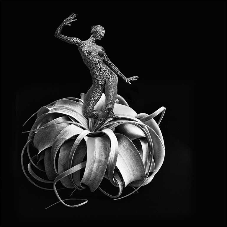 I like this a lot Helen. Your original air plant image is stunning on its own. I do agree with some of the previous comments about the crop and the lighting on the dancer. The lighting on the air plant is so dramatic and gives it so much depth that it seems the dancer might benefit from a bit more depth shading too. To my eye, the light is coming from several directions, but mostly upper right a bit in back of center. I don't seem to be able to distinguish the shadow placed by Steve, so maybe I'm way off the mark here, but I've lightened the top right of her head, shaded the underside of her raised arm and left side of her torso, and placed a shadow sort of left-diagonal beneath her. Love your composite and it's a great study in dynamics. Well done! |