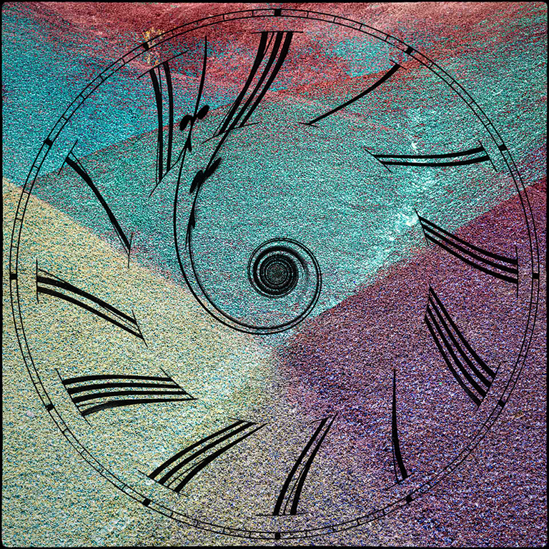 The colors you pulled out of this image are very cool, Phil. I do see Steve's downhill skier too. In the right setting, and maybe printed on metal, I think this could be a nice calm image for a wall. But I also agree that it has a ton of potential as a backdrop. Maybe something like a very simple silhouette of bare aspen trees in front, or a funky swirled clock cutout as I've done here. The sky's the limit really. I definitely like what you've done. |