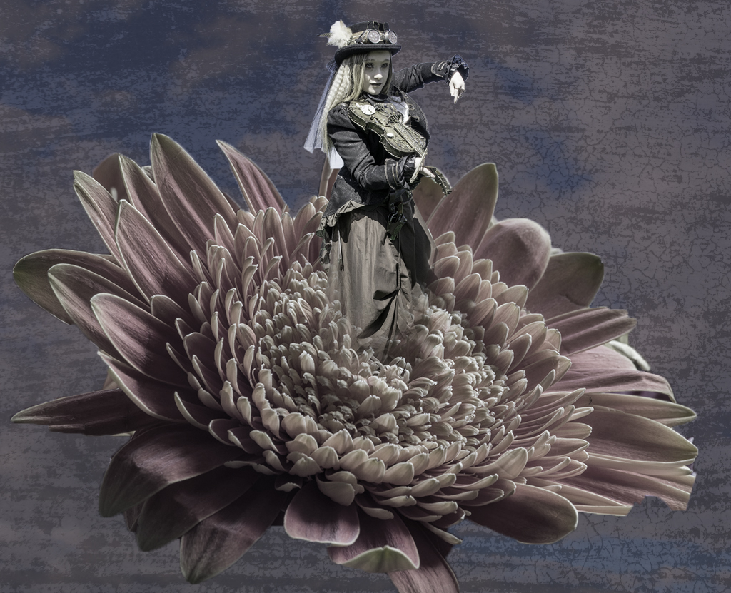 I really like the color toning you've got going here Steve; it complements the Goth theme nicely and it's very unique. You've done a nice job with your two main elements having similar lighting angles. I sort of feel like the flower is overpowering and competing with the fiddler a bit. Maybe if the important and expressive part of her body was above the flower (extending into the plainer sky area), it would give her more strength. I tried a very quick and crude version to show my point, but I didn't even manage to grab all of her fiddle and bow when I selected her. And my colors are way off, but at least it illustrates the point I was trying to make. Your composite combos always intrigue me and this one is really nice. |