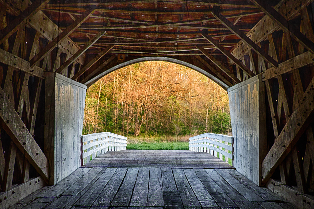 This is a lovely nostalgic image, Georgianne. Your original shot of the bridge is very nice; you kept the detail in the bright foliage outside the bridge and good structure inside the dark bridge. I agree with Steve and Candy about the placement of the bird. To my eye, the fact that your texture photo is a lot lighter on the left side than the right side is causing the final image to be less dramatic than your original bridge shot. I tried rotating your texture 90 degrees, cropping off the bright area, then sizing it to fit the dimensions of the original bridge. I used soft light mode at 79% on the texture layer. Your story of the adventure in capturing this image is charming, and your interpretation of the final is as well. |