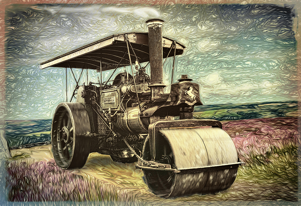 This is a fun image, Steve. Love your title! All of the effects you used appeal to my eye. The steam roller being monochrome with the background in color works nicely. I didn't notice the smoke coming from the stack until I read your description, so I tried a version with the smoke dodged a bit. While I was at it, I also added a shadow under the steamer. I like the motion blur you added to the wheels to bring in movement. It seemed to me that the flat surfaces of the wheels would show movement also, so I added a bit there too. I love the old fashioned, muted colors you gave your final composition. Well done! |