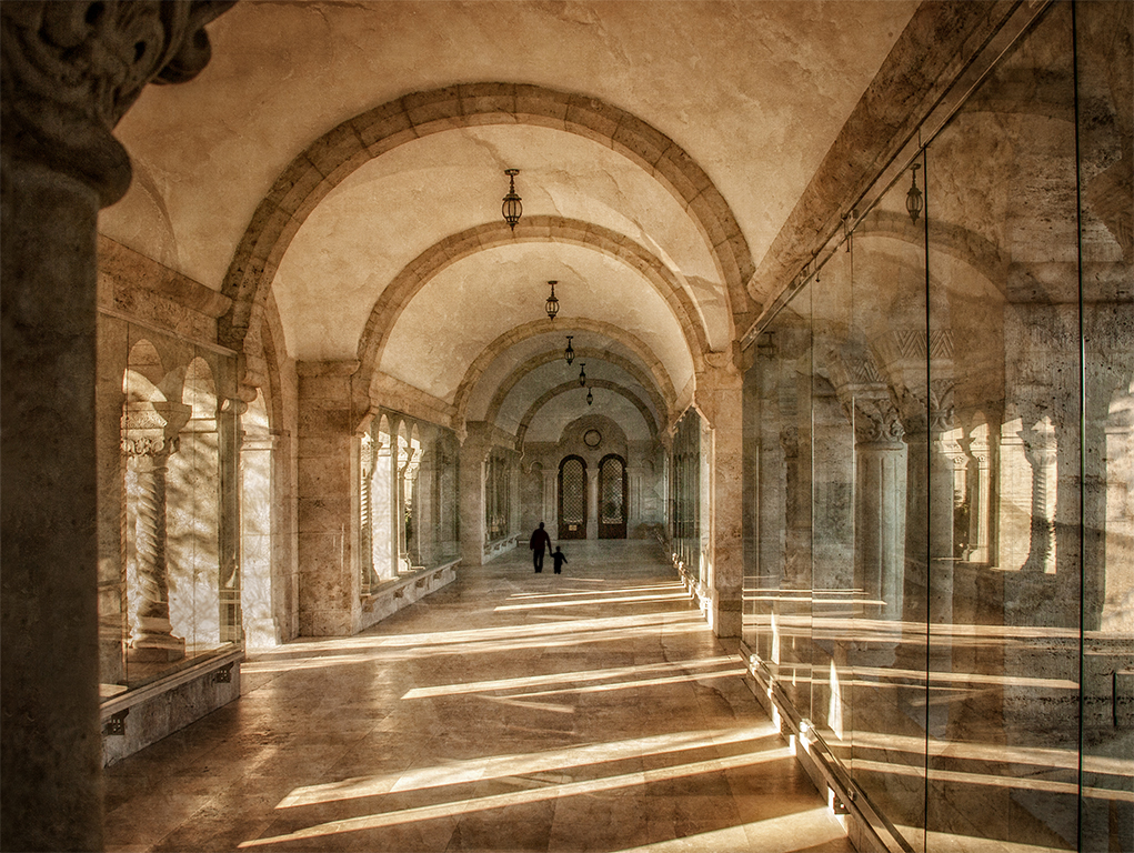 You did a fabulous job of bringing out the details in this image, Candy. The long shadows reflected in the glass make a nice pattern and the leading lines that carry your eye to the dark arches at the end of the hallway are great. The stone texture you added was a super idea; it made everything look like it was made out of beautiful marble rather than boring plaster. I also really like that you kept the turquoise coloring at the end. It occurred to me that having a person somewhere might be a nice addition, so I tried a version with a man and child silhouetted in the distance. |
