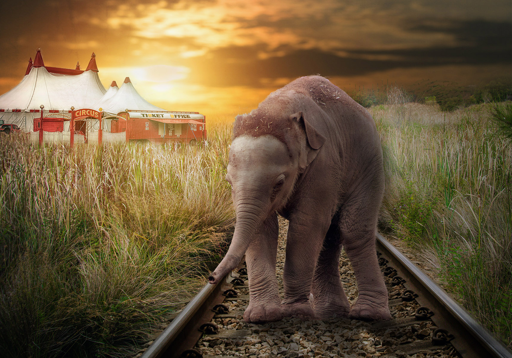 This is great Denise! Brings back memories of the circus from my childhood, plus it's fanciful with it's concept of running away from the circus. Your choice of images to combine is great. For me, the only thing I noticed as being a bit incongruous was the elephant's shadow, as it would be more elongated at the sunset (or sunrise) hour. I've added a longer shadow moving away from the sun source and also darkened the side of the elephant that's not being lit by the sun. Minor tweaks, to be sure; your original is charming and well done! |