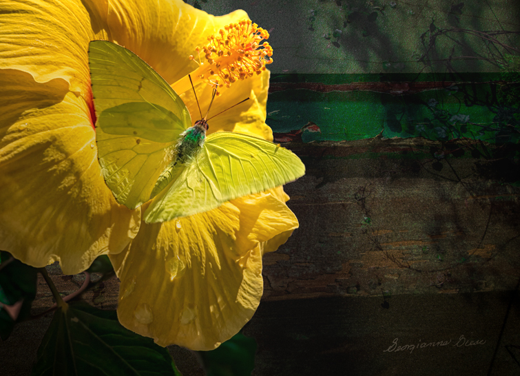 I like the story you've presented here Georgianne. I'm also a fan of old buildings so I really like your treatment to the right of the flower. The sunlit leaves to the left of the flower seem a bit distracting to my eye. So I tried adding a spotlight effect in PS (Render>Lighting Effect>Spotlight) to highlight the moth and stamen. Once I did that I decided to see what it would look like to place the head of the moth and the stamen more in the rule of thirds upper left quadrant and kind of liked it because it meant the old building got to stay in the image. |