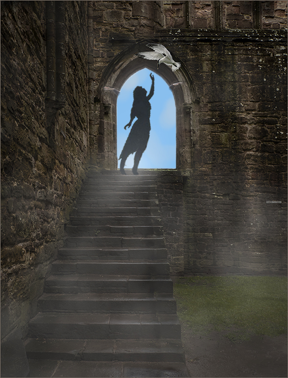 The stone steps and archway create a wonderful mood, Candy. Taking out the railing was a great move. The addition of the mist was a nice idea too. I agree with Alan about the pose of your granddaughter. I'm sure it made total sense when she was standing in the cemetery though. I like the addition of the bird, and you placed it beautifully to conform to the arc of the doorway. I feel like it's an important part of the image, so it's okay that it's one of the brighter elements. It seemed to me that having some interaction between the person and the bird might engage the viewer more. I tried changing your granddaughter's arms to reach up toward the bird, but I failed at that miserably. So I just found a silhouette image and added it in to illustrate my point, but a non-silhouetted image would be much better. It looks like many of our group are spending time in the clouds and mist this month! Your concept here is lovely. |