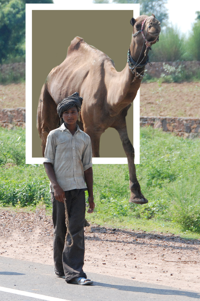 I like your idea here a lot, Alan. The colors are very nice. The symbolism of a window connecting two different worlds works well. I'm not bothered by the rope being behind the boy because the camel is behind him too. Since both of the camel's front legs are at nearly the same plane in the original, I think they should both be in the final image. To me, if you just add a strong shadow right under the boy's foot, it will anchor it so it won't appear to be floating, as Candy noted. I'm curious as to why you made the shadow go the direction you did, even though the shadow in the original image was different. I think if you had kept that original angle, it might have kept the image from feeling like it didn't "gel" as Steve noted. I played with your final and added the second front foot, darkened the shadow right under the boy's foot, and lightened the shadow as it moved away from the parts of the subjects that were touching the ground. I didn't change the direction of the shadows in the interest of time. |