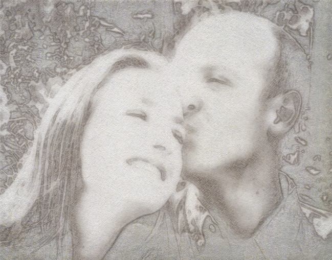 Congratulations on your grandson's engagement. I like your idea of ratcheting up the lightness of the image, although I might have gone even further. I agree with Alan's comment about the poof of hair and with Steve's about the couple needing to dominate the composition more. Since I had a little time on my hands sitting here at home in the pouring rain, I experimented with a couple of iPad apps. First into Snapseed to make it black and white high key, which eliminates the poof of hair issue. Then I cropped in closer and used Artista to change it into a sketch. Not a lot of detail but I think they're still recognizable. Your idea of a simpler background was a good one. |