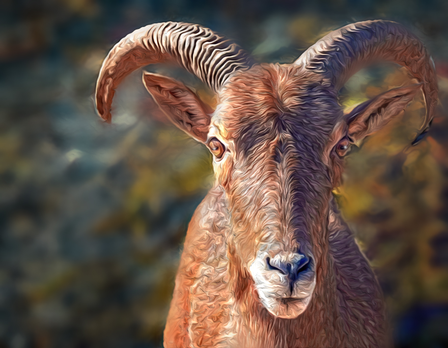 This guy has a lot of personality Georgianne. I love the way he's looking right at the viewer. I agree with the other comments about the background being a bit busy. Since I'm a big fan of filters, I decided to try a couple on the ram to see what would happen if he was taken into that realm. I added dynamic contrast and HDR effect in On1 and blurred the background while I was there. Then back in PS I added subtle Oil Paint, a catch light in each eye and a vignette. I also cropped it to place his face in the upper third quadrant. Not sure it's an improvement, but I had run playing. Nice original subject matter for sure! |