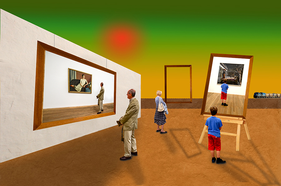 There's a lot to see in this composite Alan. Like Gwen, my eye was pulled to the orange sun and, in my humble opinion, the piece would be stronger and more sophisticated without it. There are plenty of other thought-provoking aspects to your image. I love the way you made the empty picture frame float by placing its shadow so far below it, but grounded the easel by placing that shadow next to it. However, you know me and my focus on shadows... all three people seemed to be floating above the floor and in need of deeper shadows directly under their feet, which I applied here. I also enjoyed the humor of the grown man viewing a prim and properly clothed woman, while the little boy is eyeing a nude. Nicely conceived and executed. |