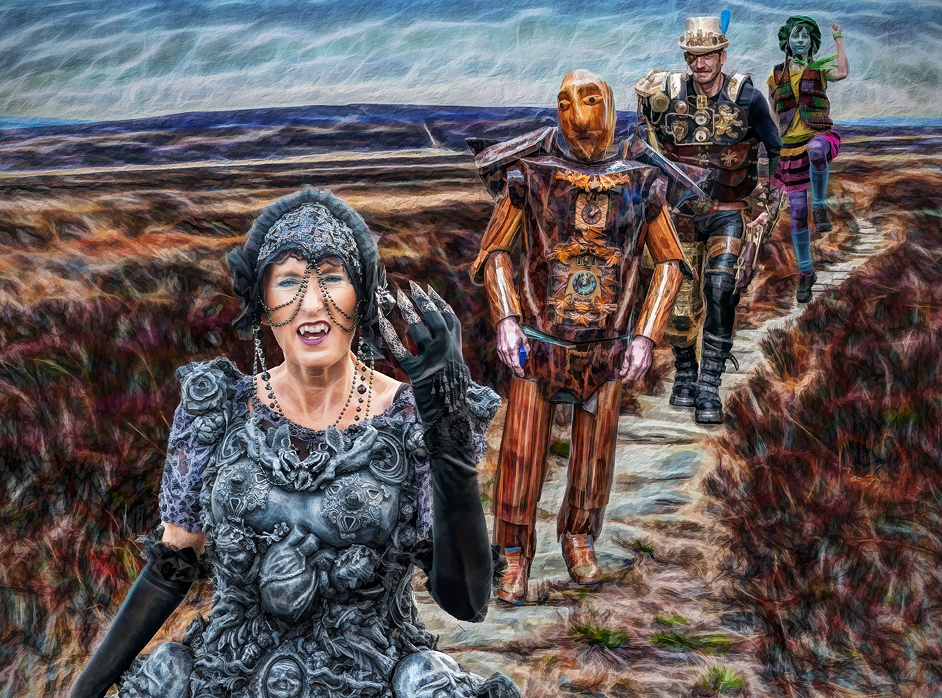 Your Goth woman in the front is wonderful; I love the HDR look of her beautifully detailed gown.The treatment of the background worked well to tie all the elements together. The hills in the distance take on a look of a seashore with breaking waves in your final version. The folk dancer seems a tad too saturated in comparison with the other figures, so I reduced it a bit. This is a very well composited and fun image Steve. Makes me want to join the parade! |