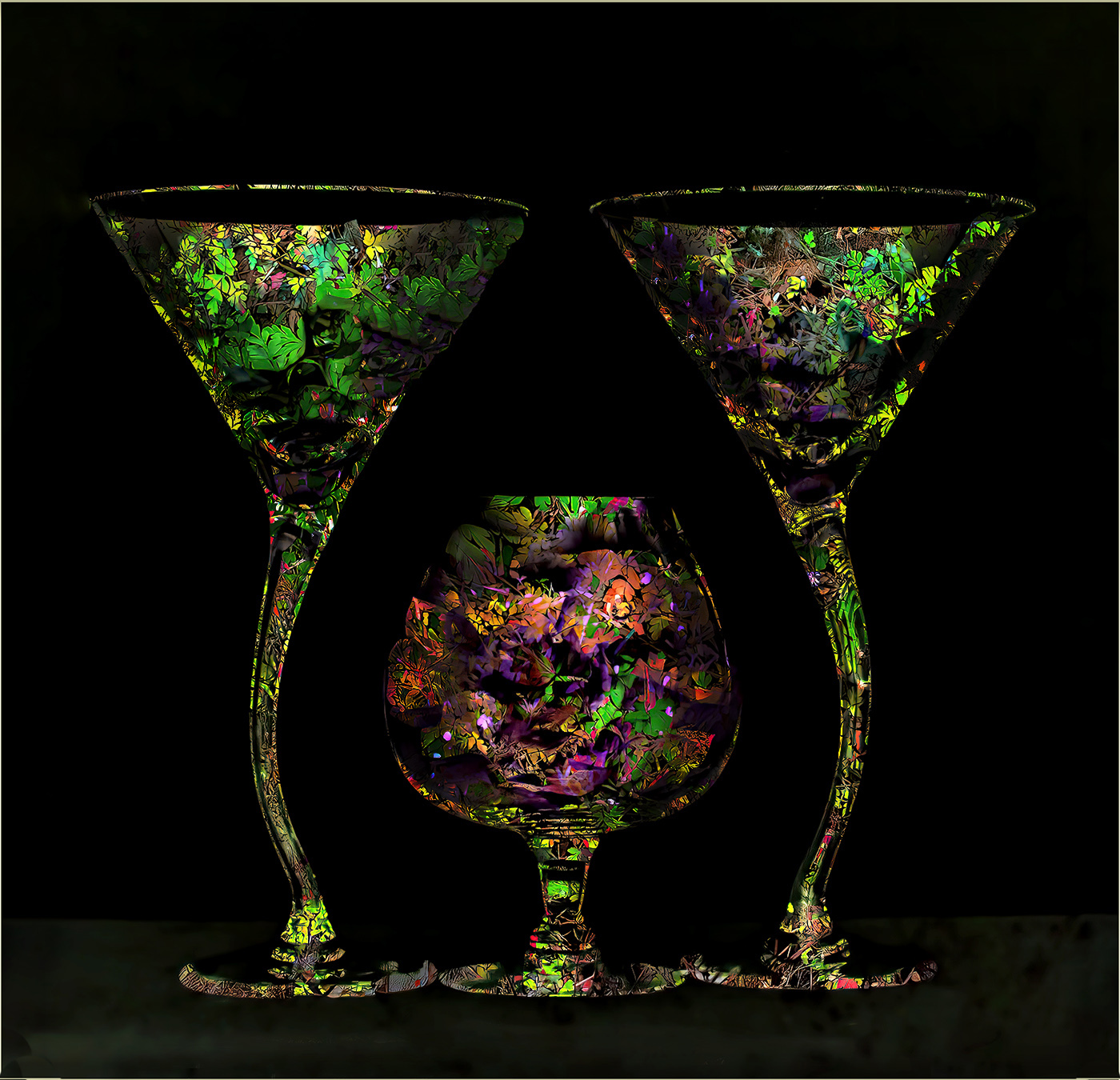 This is very cool Gunter. I love the contrast between the glasses and the black background. I agree with Steve that the glasses need a bit more depth, so I took the liberty of using the burn tool on the outside contours and the dodge tool on the center areas to make them look more rounded. This would make a very nice set of glassware. Nice concept. Pour me a drink! |