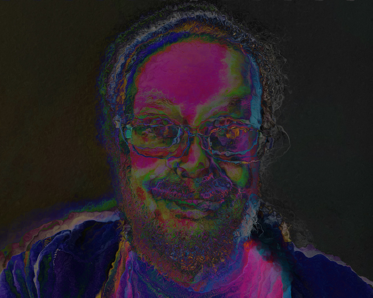 Another popping colors image. As charming as your selfie is, I would like to see you use a new photo going forward, since you have shown this same one in several past months. The large dark brown area in your forehead detracts from the other colors here, in my opinion. I know you've said you favor this style, so you might try the Solarize filter in PS for an alternate way of getting to the look you might be after. I've used it three times and changed the blend mode, hue, and saturation each time. Then I used the Glass filter to give it an additional bit of movement. Of course, this may not be to your liking at all, but my point is that there's joy to be found by experimenting with all the wonderful and diverse filters in PS. |