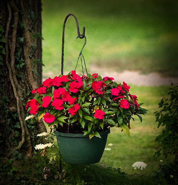 I guess I should have mentioned it in my comment, but in my rework, I cloned out the plastic looking part of the hook so it's not quite so obvious it's plastic. I think keeping it hanging is part of the charm, especially with the curvy shepherd's hook as the support. |