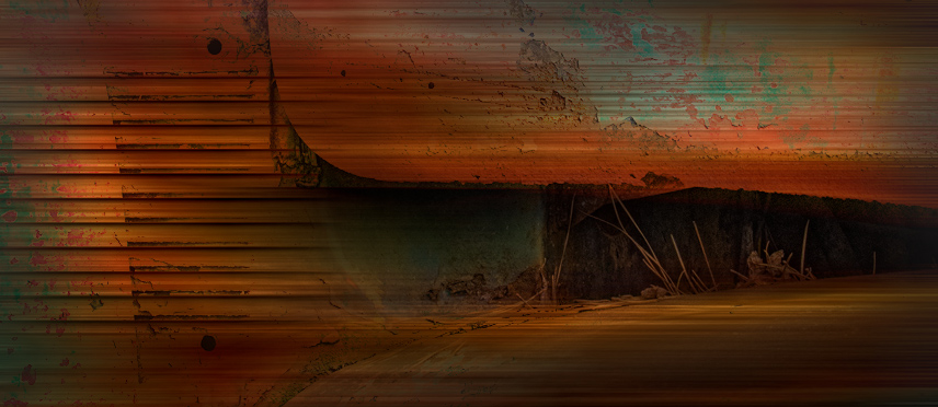Great rusty patina here Candy. It looked like a fun image to play with, so I gave it a try. My favorite part from Original 2 was where the open hood revealed the pine needles and the horizontal lines to the left. I cropped in to that small part. You know me, I love motion blur, so I applied a horizontal one and used Darken blend mode so some of the rusty details showed through. The dark recess came out too black and empty, so I applied a mask and brought back some of the pine needles. Just a different take on your interpretation. Your treatment has given it an abstract look with such wonderful colors and textures. |