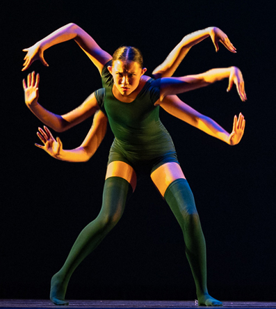 The stage lighting is so dramatic and unique. It really adds to the mystique of your final image. You did a great job of capturing several good shots under difficult conditions. My only suggestion would be to keep the same lighting and intensity on all of her arms, rather than making four of them darker. I think it would make it look more like all of the arms were actually hers. I didn't take the time to fine tune where the arms connect to her body, but include this version only for illustration. Your grand daughter appears to be an excellent performer and a wonderful photo subject. |