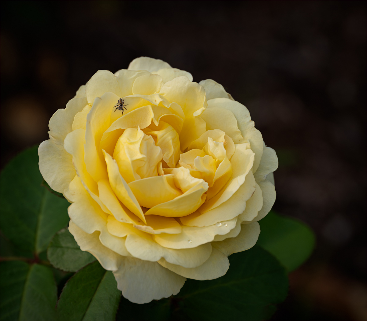I think all your decisions were good ones Denise. The flower has nice texture but isn't harsh or overdone. I also like darker backgrounds to make a beautiful subject like this pop, and the vignette is just right. I notice there's a very sweet dew drop with great lighting on one petal. So I had a little play with adding another two just for fun. While I was at it, I added a very thin green key line since the top is dark enough to blend into our black background. Your edits have all taken the original image into the realm of stunning. And even though I'm not a spider fan, I have to admit this little guy has a certain charm. Nice! |