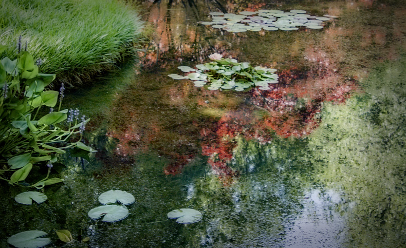 What a lovely place to pass away some time and snap some shots Georgianne. It almost seems to like there are two different compositions here. The upper part shows the beautiful reflections; the lower part accentuates the Monet-like textures. It kind of seems to me like there's too much going on. Forgive me, I'm a minimalist at heart, so I tend to favor pared down compositions. I took the liberty of having a little play with your sweet image by cropping, then adding Glow and Dynamic Contrast in On1. Certainly not better, just different. |