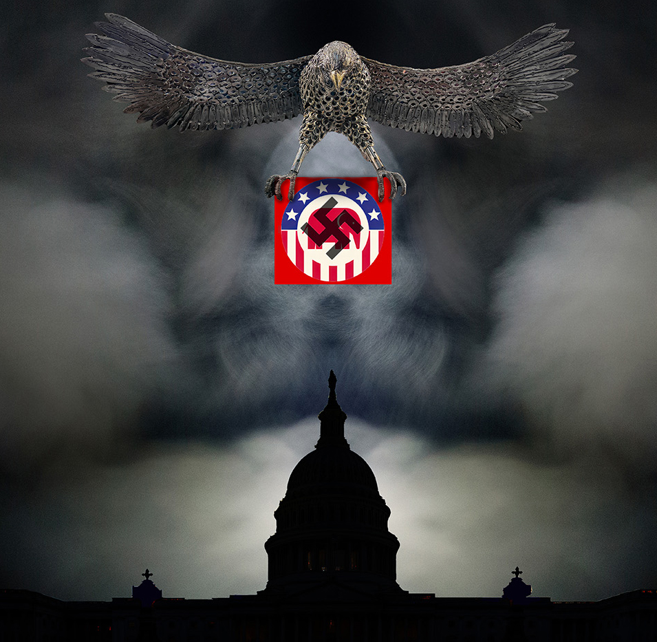 This is a strong statement Peter. Your combination of images is striking. You did a great job getting the eagle isolated from all the lights and reflections. The fact that the GOP/swastika part is the only highly saturated area makes it really stand out. A couple of nit-picky suggestions: In a "real world" situation, the eagle's talons and body would cast shadows on the symbols, so by adding that detail, it helps them look less pasted on. The capitol building has some white halo edges, especially noticeable where the background is dark. I love the breath vapor idea to give the sky real drama and evilness. I think I like it as in your original though, rather than making it mirrored. I like the crop on your original image, but I used your revised version to demonstrate the shadowing. A very well constructed composite. |