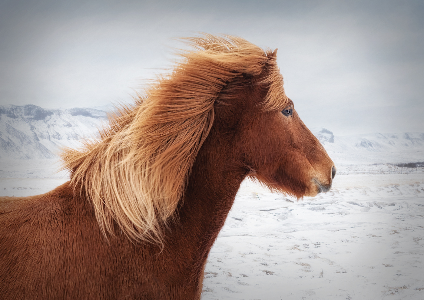 This is great Carol. It makes me cold just looking at it, but that's what makes it impactful. What you did to the background worked well to accentuate the horse. It's cool that his eye is looking at you, but his head is still in portrait. I wondered if a bit of glow and vignette would add anything to your lovely image, so I gave it a try. |