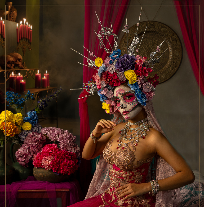 Hi Frans. This is a very cool image. The colors are wonderful and the sugar skull is beautifully done. My only suggestion would be to get rid of the bed frame. My eye gets pulled there rather than to the model. And it's kind of confusing as to why she's sitting on a bed. I did a quick edit to try that out by just cropping it off the bottom and then using the clone tool to add the background color over the back part of the bed. I didn't take the time to add your nice key line on the bottom. I like your addition of the candle altar; you did a great job of making it look like it was there originally. Well done! |