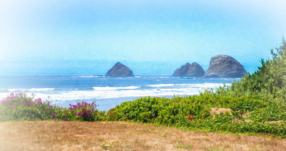 The painterly filter you applied works nicely. And I like the increased saturation in your final. To my eye, the scene might benefit from a bit of cropping; the brown foreground seems too dominant, and the big sky seems to make the wonderful haystacks seem less important than they should be. I also cropped off the dead upper branches of the pretty green foliage on the right. What a lovely view to ponder as you enjoyed a leisurely lunch! |