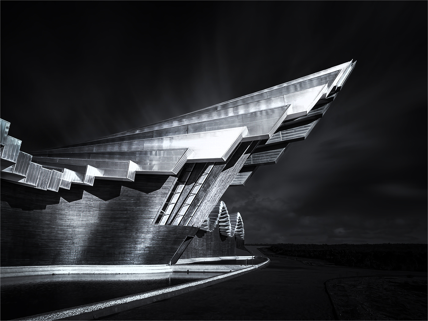 What a great building, Carol. Black and white is definitely the best treatment for it. I like what you did to add drama, and you might want to consider adding even more contrast. I increased the contrast quite a bit and then did even more dodging and burning. I probably went a bit too far in an effort to make it noticeable. I agree with Denise that the part of the roof you cropped off had some nice detail and interesting lighting. Calatrava's architecture is so very unique and I very much enjoyed seeing this structure. Well photographed and processed. |