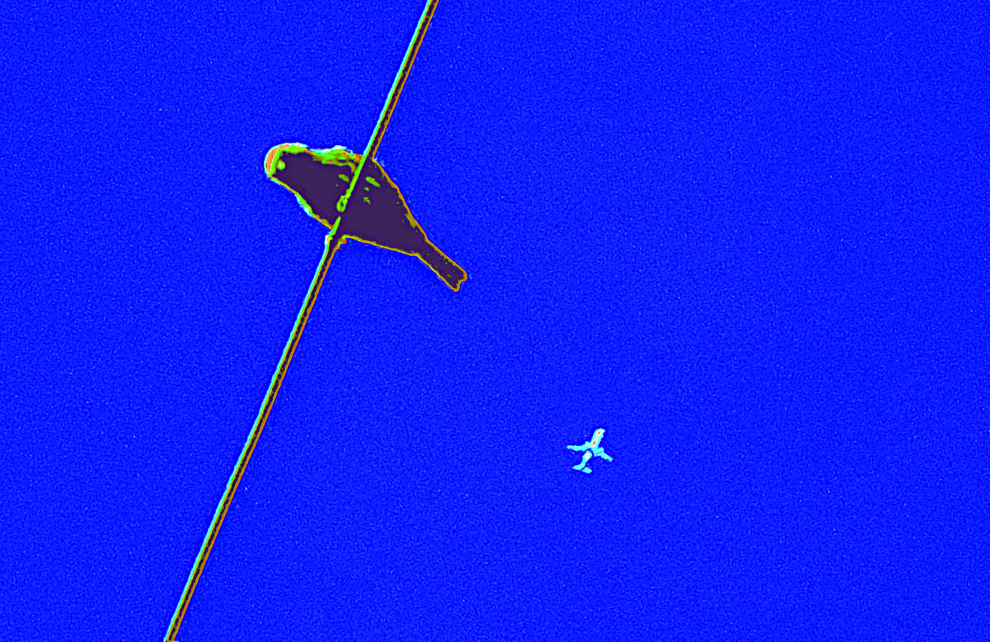 I like the simplicity of this image, and it is true to your style since it's in the non-realistic realm. I also like that the bird is large and the plane is small. It might look cool to crop the top slightly so the bird is in the rule of thirds and then move the plane so it's not on the same sight line with the bird, for a less static composition. |