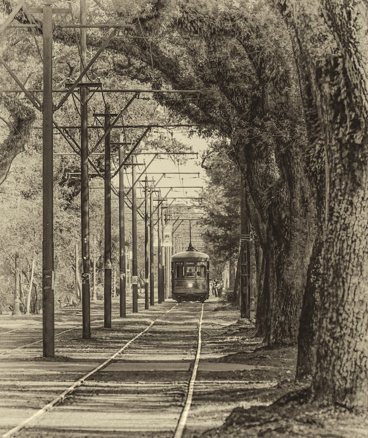 Hi Rita. I also recognized the St. Charles line trolley, so it brought back great memories of my one visit to New Orleans. I love the curve of the trees and the straight lines of the telephone polls in contrast to each other; nice juxtaposition. I agree that removing some of the small distracting elements is a good idea. And I would go a bit further and get rid of the cars on the left (especially the dark one on the left border). The tracks provide perfect leading lines to the trolley, so I used the dodge tool to lighten them up a bit. I think the antique filter you used worked great. Good luck with your entry! |