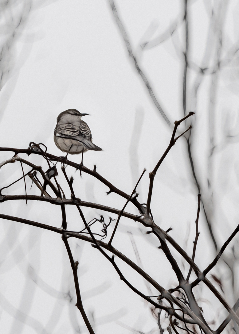 I love your treatment of this image Denise. The foreground twigs in focus and the blurred background ones give it a lot of depth. You pulled a wonderful amount of detail out on the bird. I agree with Georgianne regarding the crop; placing the bird in the rule of thirds seems to be called for here. It also seemed to me that your concern about it perhaps being too busy could be mitigated a bit with a different crop too. I took some off the top and left side, but when I did that the lovely background twigs in the upper left got eliminated, so I just copied that corner and moved it over after the new crop. I also like a catchlight in live subjects' eyes, so I added one as a final step. You've got so much rich and interesting detail in this image; well done. |