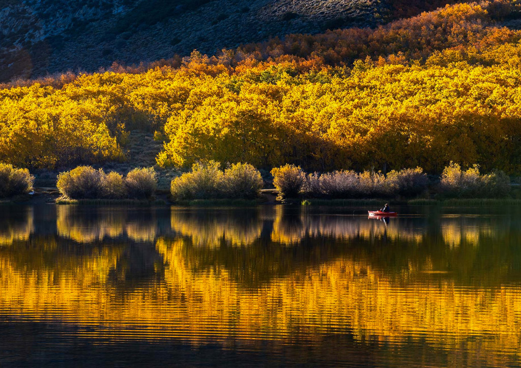 A beautiful fall scene. I especially like the golden colors along the shore and their reflection in the water. The person in the red boat gives this an extra pop. The highlights in the trees seem slightly too bright. Just lower that a tad. I do suggest cropping. The dark area in the upper left corner doesn't add anything to your image. I also think cropping would allow you to bring the boater into the photo more. Attached is my imperfect revision to give you a little better idea of what I'm suggesting. Great work, though! You've got a wonderful eye for scenery. |