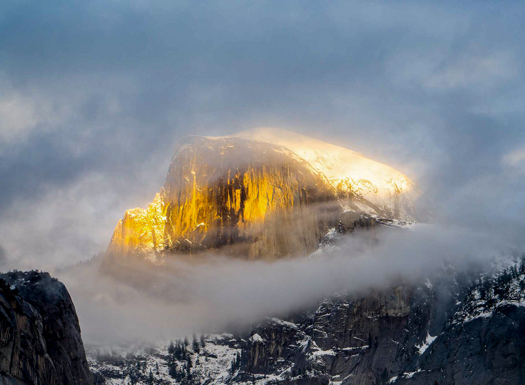 I think the bright golden colors on Half Dome overwhelm the image. The bottom part lacks any visual appeal, to me, and looks a little junky. So, why not focus on the outstanding feature -- Half Dome. I've come up with a different option by cropping onto the mountain, adding some more contrast and darkening a tad to bring out a little of the blue skies. Just a thought. |